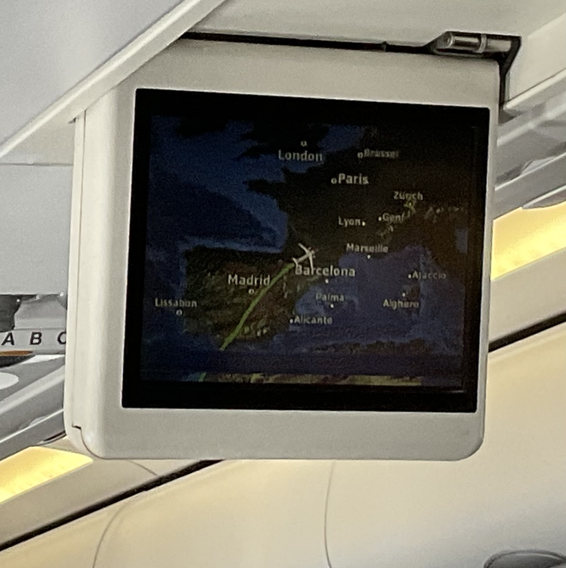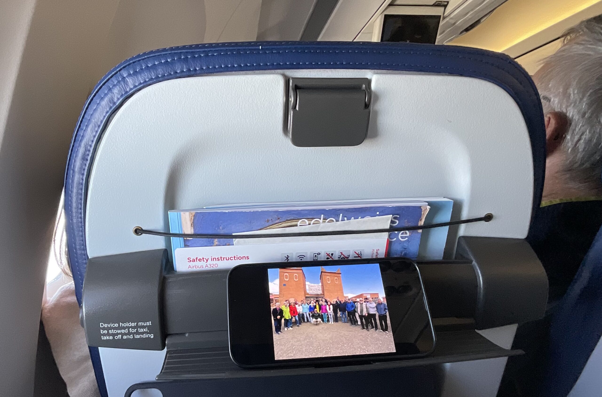 Es ist wahrscheinlich der kurzen Nacht geschuldet, dass im Flieger die Funktion am Vordersitz erst auf den 2. Blick erkannt wird – man kann dort ein Handy oder Tablett einklemmen um die Entertainmentprogramme bequemer zu guggen.