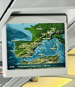 Heute geht’s es also endlich los. Wir starten bei eiskaltem Wetter in Böblingen und fahren mit dem Bus nach Zürich. Es bleibt am Flughafen Kloten genügend Zeit, die Kofferanhänger beim Automaten anhand der Bordkarte rauszulassen und einige haben es sogar geschafft, die Anhänger schon zu Hause beim Check-In anzufordern und auszudrucken. So geht es Ruckzuck, bis alle auf dem Weg zur Sicherheitskontrolle sind. Dort wird auf 3 Ebenen abgefertigt, man muss nix aus dem Rucksack in die Schalen legen – keine Flüssigkeiten, keine elektronischen Geräte – und schon geht es in den A320 der Edelweiss Air.