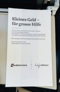 Eine interessante Beobachtung noch aus dem Flieger: Früher gab es „Kotztüten“ in den Sitzennetzen vor einem, jetzt gibt es Spendentüten für einen guten Zweck. Die Zeiten ändern sich eben.