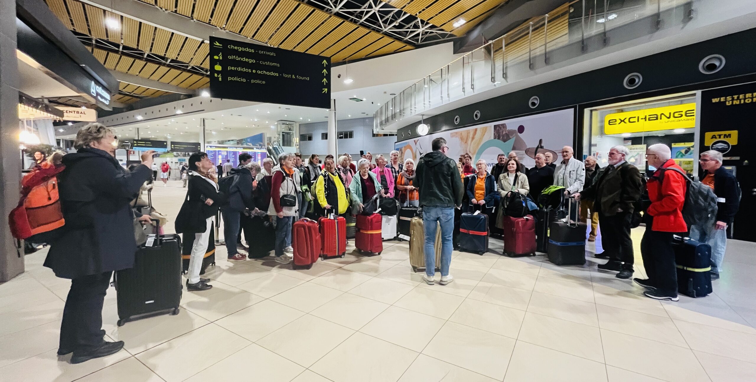 Heute geht’s es also endlich los. Wir starten bei eiskaltem Wetter in Böblingen und fahren mit dem Bus nach Zürich. Es bleibt am Flughafen Kloten genügend Zeit, die Kofferanhänger beim Automaten anhand der Bordkarte rauszulassen und einige haben es sogar geschafft, die Anhänger schon zu Hause beim Check-In anzufordern und auszudrucken. So geht es Ruckzuck, bis alle auf dem Weg zur Sicherheitskontrolle sind. Dort wird auf 3 Ebenen abgefertigt, man muss nix aus dem Rucksack in die Schalen legen – keine Flüssigkeiten, keine elektronischen Geräte – und schon geht es in den A320 der Edelweiss Air.